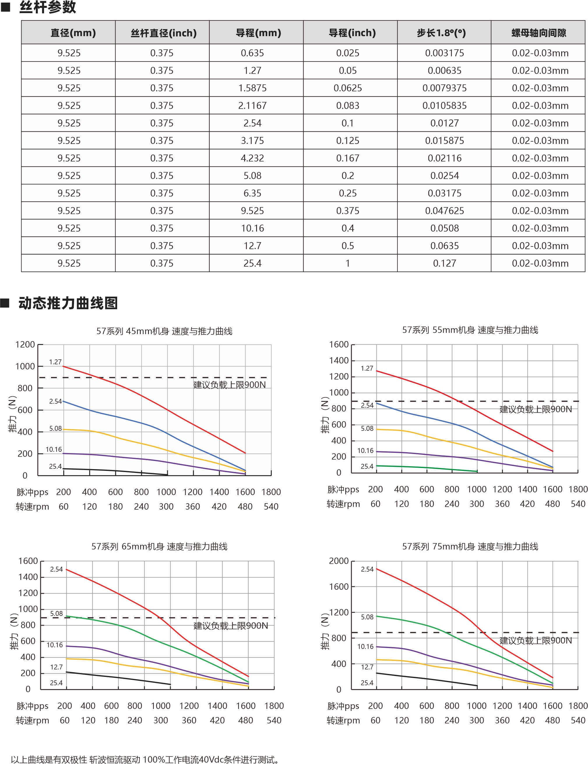 57系列絲桿電機(jī) 57系列絲桿電機(jī) 動態(tài)推力曲線圖 外形圖  相數(shù) 步距角精度 IP等級  認(rèn)證 絕緣等級 運行環(huán)境溫度 2 ±5% 40 RoHS CE ISO9001 B(130℃) -20℃~ +50℃ 螺母類型 電機(jī)參數(shù) 57 45mm 0.7 3A 0.75Ω 0.72mH 2.25V 3A 0.92Ω 4.5mH 2.76V 4A 0.78Ω 3.3mH 3.12V 電機(jī)類型 機(jī)身L(mm) 保持力矩(N.m) 額定電流(A) 電阻(Ω) 額定電感(mH) 額定電壓(V) 絲桿參數(shù) 0.375 0.635 0.025 0.003175 9.525 0.02-0.03mm 0.375 1.27 0.05 0.00635 9.525 0.02-0.03mm 0.375 1.5875 0.0625 0.0079375 9.525 0.02-0.03mm 0.375 2.1167 0.083 0.0105835 9.525 0.02-0.03mm 0.375 2.54 0.1 0.0127 9.525 0.02-0.03mm 0.375 3.175 0.125 0.015875 9.525 0.02-0.03mm 0.375 4.232 0.167 0.02116 9.525 0.02-0.03mm 0.375 5.08 0.2 0.0254 9.525 0.02-0.03mm 0.375 6.35 0.25 0.03175 9.525 0.02-0.03mm 0.375 9.525 0.375 0.047625 9.525 0.02-0.03mm 0.375 10.16 0.4 0.0508 9.525 0.02-0.03mm 0.375 12.7 0.5 0.0635 9.525 0.02-0.03mm 0.375 25.4 1 0.127 9.525 0.02-0.03mm 絲桿直徑(inch) 直徑(mm) 導(dǎo)程(mm) 導(dǎo)程(inch) 步長1.8°(°) 螺母軸向間隙 55mm 0.9 65mm 1.5 75mm 1.8 4A 0.95Ω 4.5mH 3.8V 4A 0.97Ω 7mH 3.88V 5A 0.7Ω 3.2mH 3.5V 2.2 84mm(貫穿除外) 100mm(貫穿除外) 2.5 25.4 5 3-Φ3.5 三角形螺母 外部驅(qū)動式電機(jī) 貫通軸式電機(jī) 57系列 45mm機(jī)身 速度與推力曲線 57系列 55mm機(jī)身 速度與推力曲線 脈沖pps 轉(zhuǎn)速rpm 200 60 400 120 600 180 800 240 1000 300 1200 360 1400 420 1600 480 1800 540 脈沖pps 轉(zhuǎn)速rpm 200 60 400 120 600 180 800 240 1000 300 1200 360 1400 420 1600 480 1800 540 1200 1000 800 600 400 200 0 1600 1400 1200 1000 800 600 400 200 0 1.27 2.54 5.08 10.16 25.4 1.27 2.54 5.08 10.16 25.4 1.5 Lx L 高柔電纜線 5 56.2 47.14 M6X1 Lx L 高柔電纜線 1.5 12 5 7 3- 5.1 28.6 40 圓形螺母 消隙螺母 57系列 75mm機(jī)身 速度與推力曲線 脈沖pps 轉(zhuǎn)速rpm 200 60 400 120 600 180 800 240 1000 300 1200 360 1400 420 1600 480 1800 540 2000 1600 1200 800 400 0 2.54 5.08 10.16 12.7 25.4 57系列 65mm機(jī)身 速度與推力曲線 脈沖pps 轉(zhuǎn)速rpm 200 60 400 120 600 180 800 240 1000 300 1200 360 1400 420 1600 480 1800 540 1600 1400 1200 1000 800 600 400 200 0 2.54 5.08 10.16 12.7 25.4 建議負(fù)載上限900N 建議負(fù)載上限900N 建議負(fù)載上限900N 建議負(fù)載上限900N 步進(jìn)直線傳動產(chǎn)品制造商 Linear stepper motor provider 步進(jìn)直線傳動產(chǎn)品制造商 Linear stepper motor provider 以上曲線是有雙極性 斬波恒流驅(qū)動 100%工作電流40Vdc條件進(jìn)行測試。