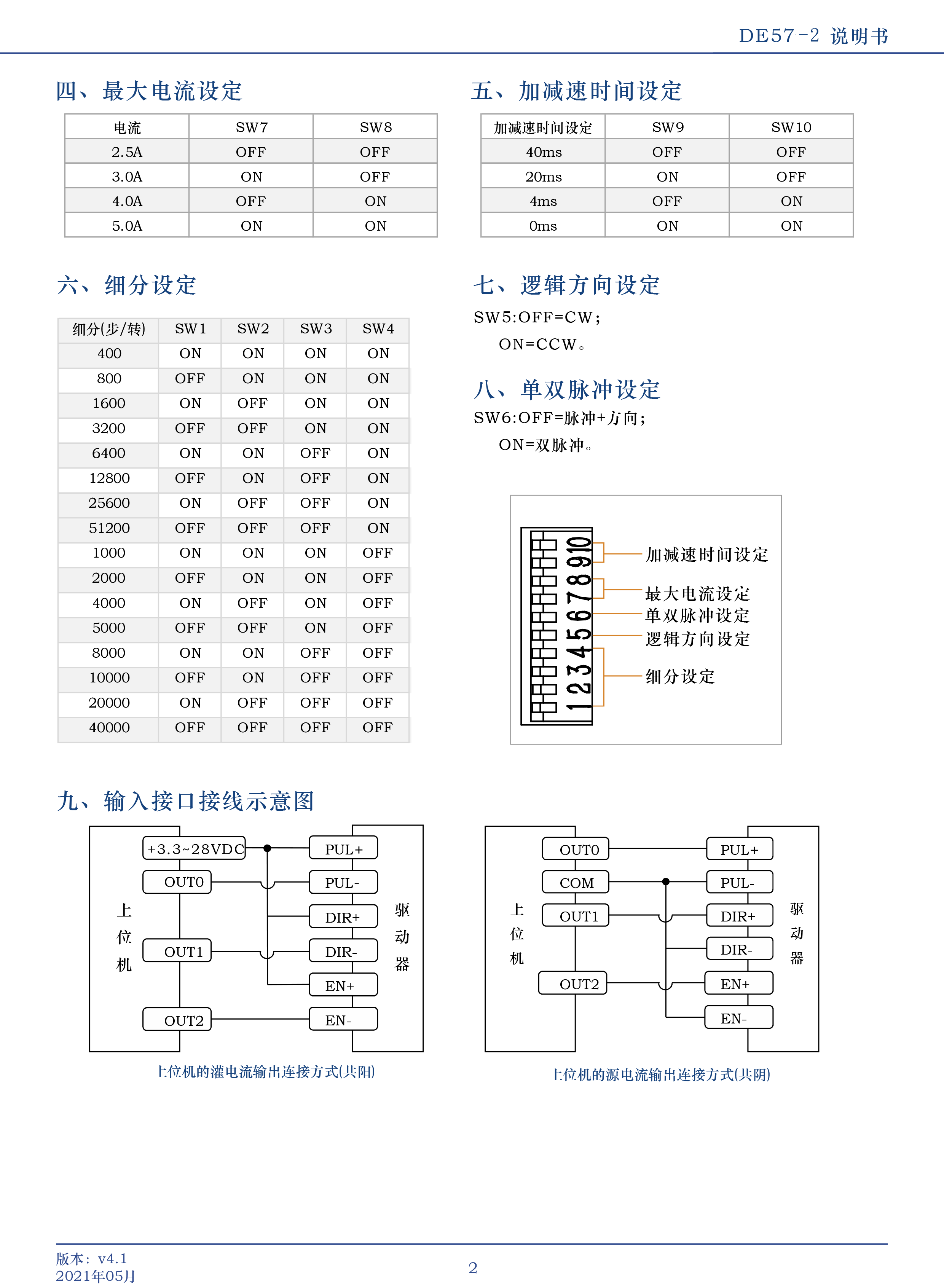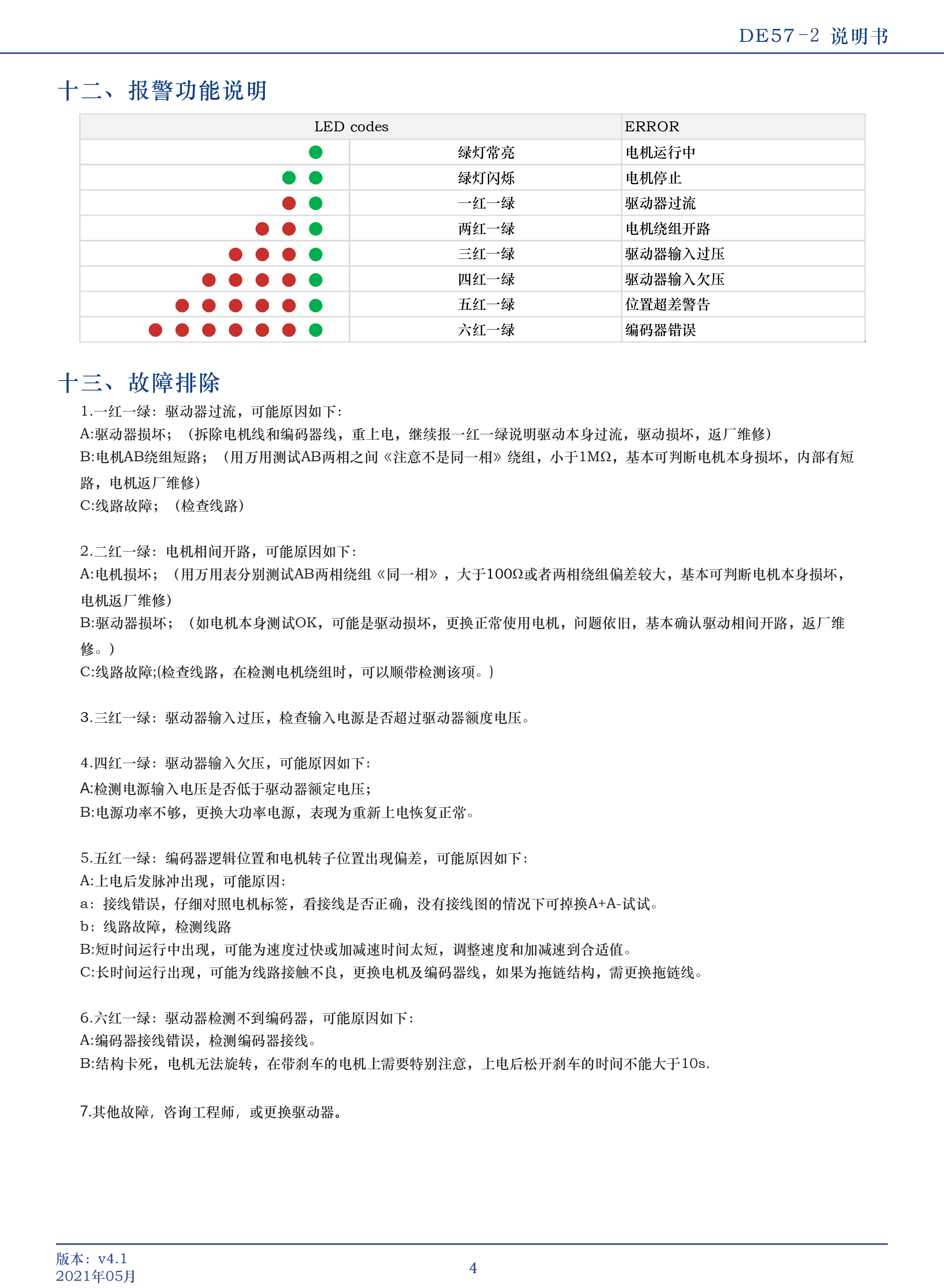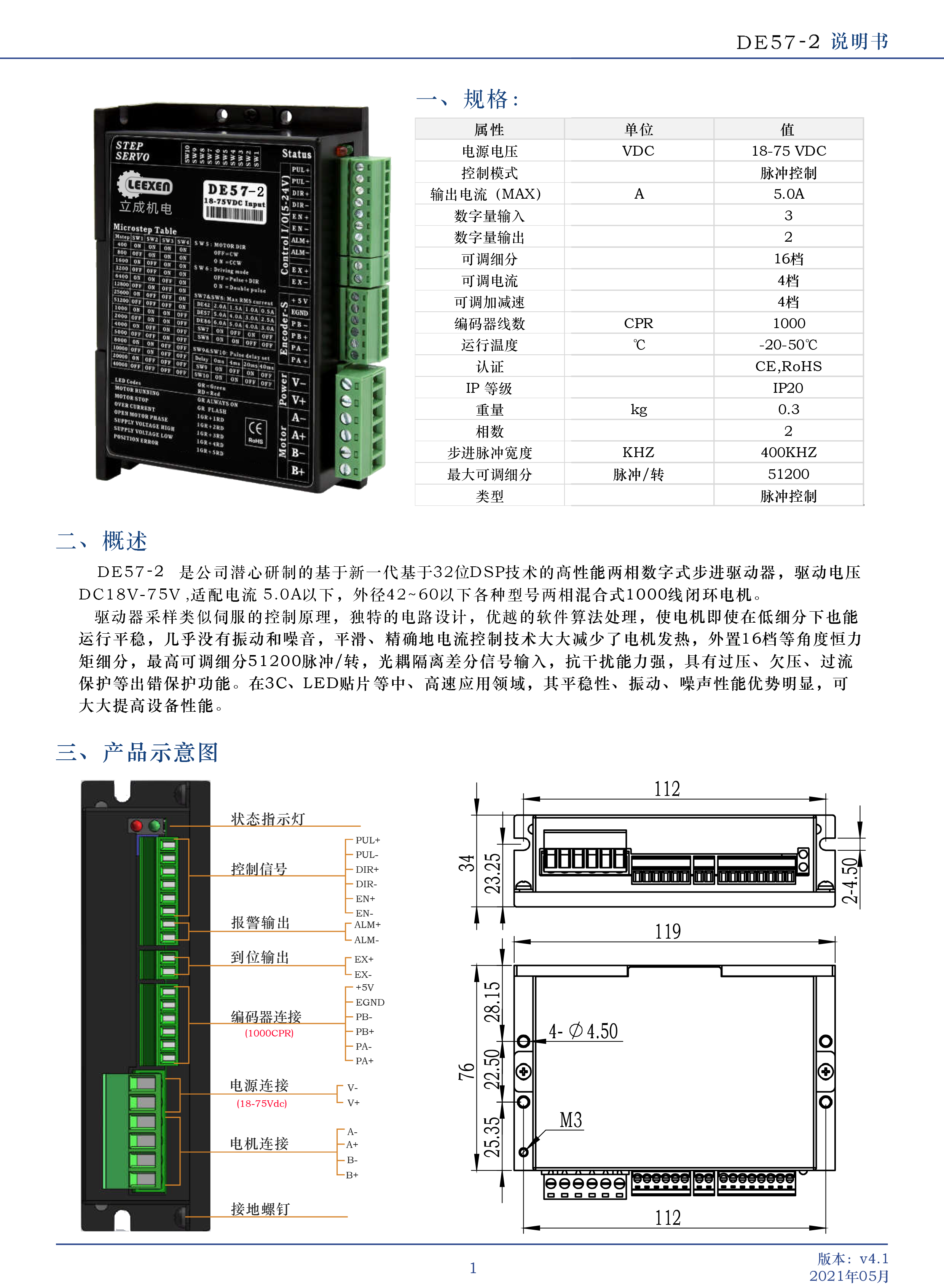 DE57-2 是公司潛心研制的基于新一代基于32位DSP技術(shù)的高性能兩相數(shù)字式步進(jìn)驅(qū)動(dòng)器,驅(qū)動(dòng)電壓DC18V-75V,適配電流 5.0A以下,外徑42~60以下各種型號(hào)兩相混合式1000線閉環(huán)電機(jī)。驅(qū)動(dòng)器采樣類似伺服的控制原理,獨(dú)特的電路設(shè)計(jì),優(yōu)越的軟件算法處理,使電機(jī)即使在低細(xì)分下也能運(yùn)行平穩(wěn),幾乎沒有振動(dòng)和噪音,平滑、精確地電流控制技術(shù)大大減少了電機(jī)發(fā)熱,外置16檔等角度恒力矩細(xì)分,最高可調(diào)細(xì)分51200脈沖/轉(zhuǎn),光耦隔離差分信號(hào)輸入,抗干擾能力強(qiáng),具有過壓、欠壓、過流保護(hù)等出錯(cuò)保護(hù)功能。在3C、LED貼片等中、高速應(yīng)用領(lǐng)域,其平穩(wěn)性、振動(dòng)、噪聲性能優(yōu)勢明顯,可大大提高設(shè)備性能。