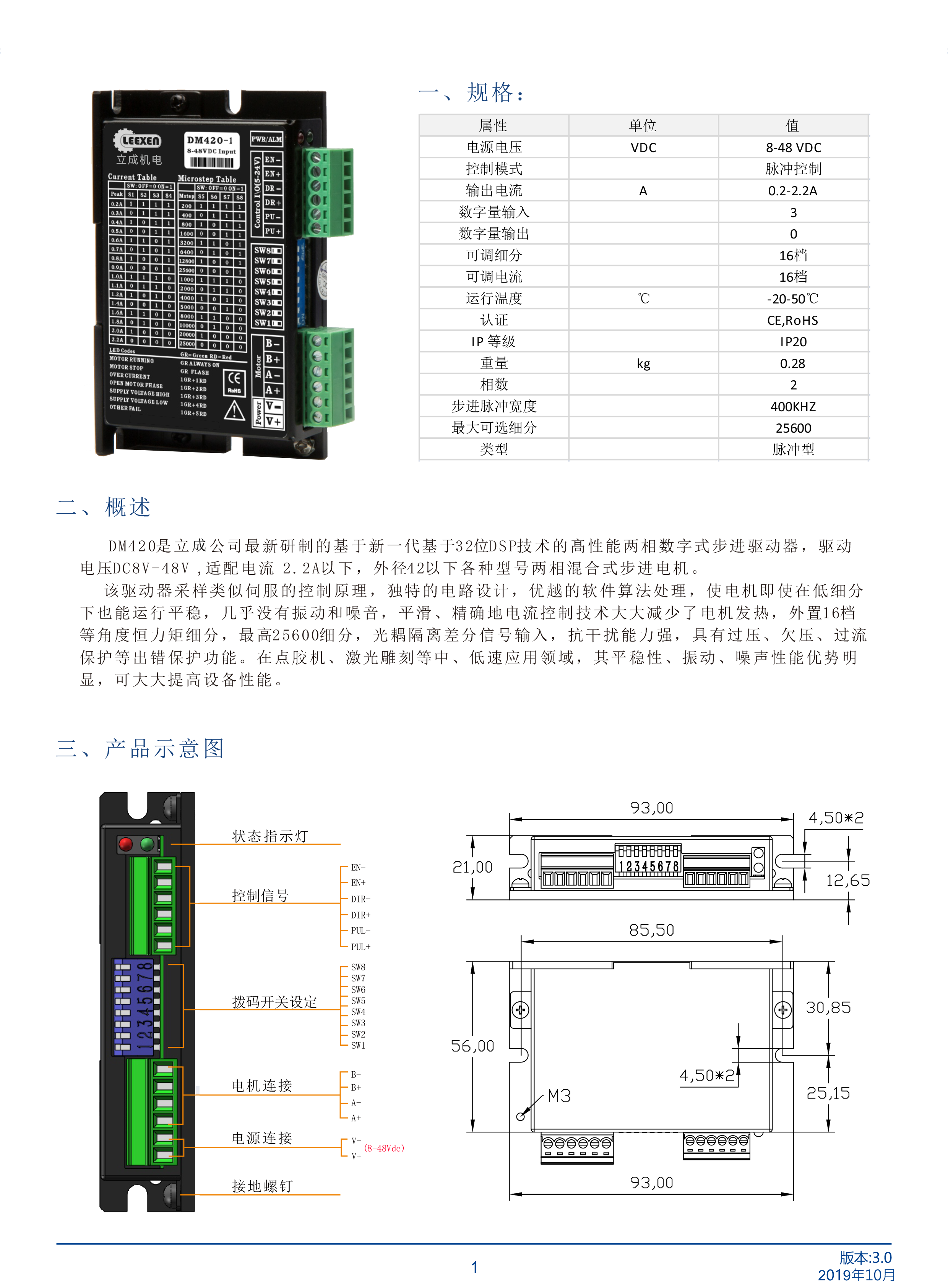 DM420是立成公司最新研制的基于新一代基于32位DSP技術(shù)的高性能兩相數(shù)字式步進(jìn)驅(qū)動(dòng)器,驅(qū)動(dòng)電壓DC8V-48V適配電流 2.2A以下,外徑42以下各種型號(hào)兩相混合式步進(jìn)電機(jī)。該驅(qū)動(dòng)器采樣類似伺服的控制原理,獨(dú)特的電路設(shè)計(jì),優(yōu)越的軟件算法處理,使電機(jī)即使在低細(xì)分下也能運(yùn)行平穩(wěn),幾乎沒(méi)有振動(dòng)和噪音,平滑、精確地電流控制技術(shù)大大減少了電機(jī)發(fā)熱,外置16檔等角度恒力矩細(xì)分,最高25600細(xì)分,光耦隔離差分信號(hào)輸入,抗干擾能力強(qiáng),具有過(guò)壓、欠壓、過(guò)流保護(hù)等出錯(cuò)保護(hù)功能。在點(diǎn)膠機(jī)、激光雕刻等中、低速應(yīng)用領(lǐng)域,其平穩(wěn)性、振動(dòng)、噪聲性能優(yōu)勢(shì)明顯,可大大提高設(shè)備性能。