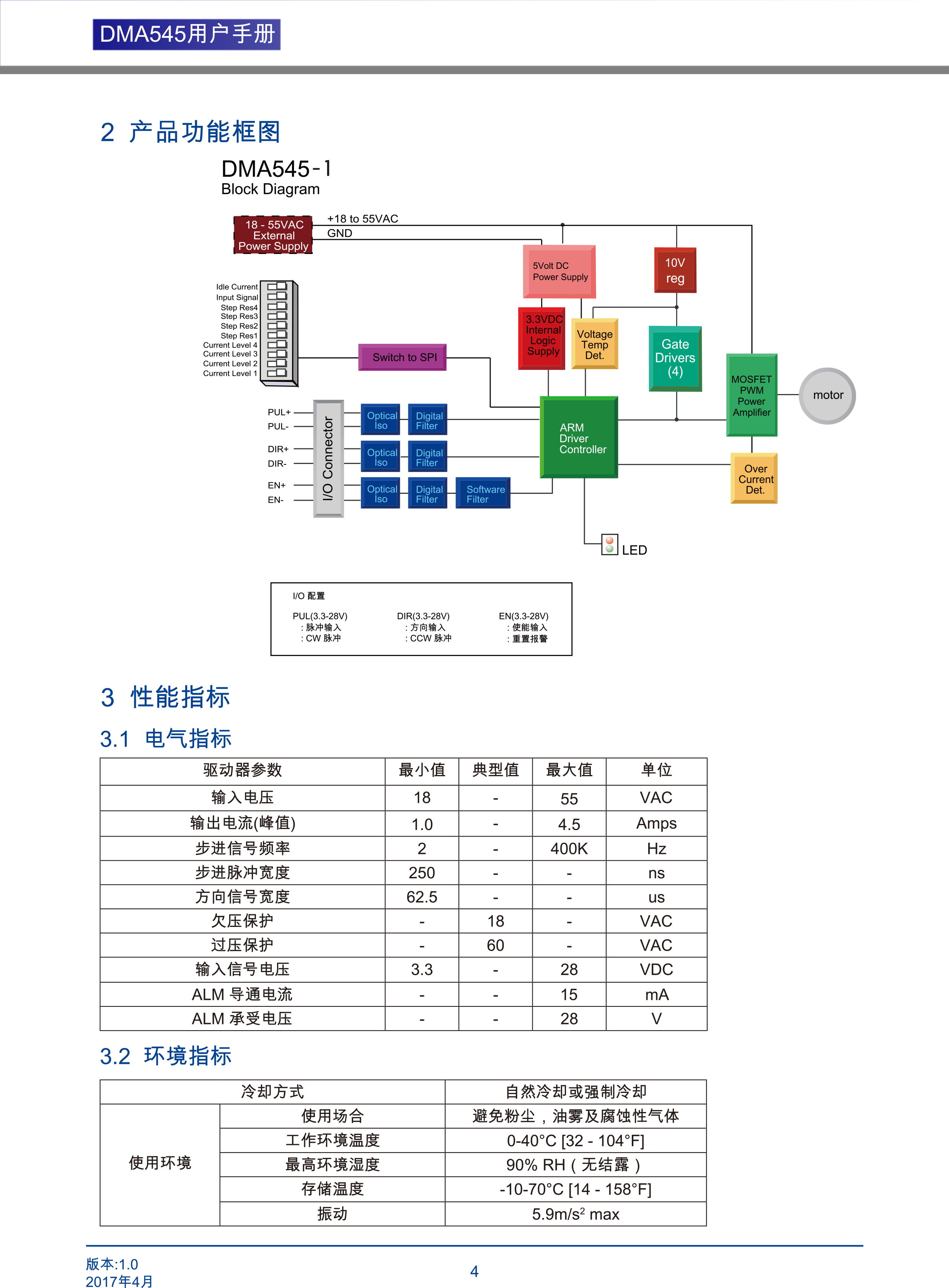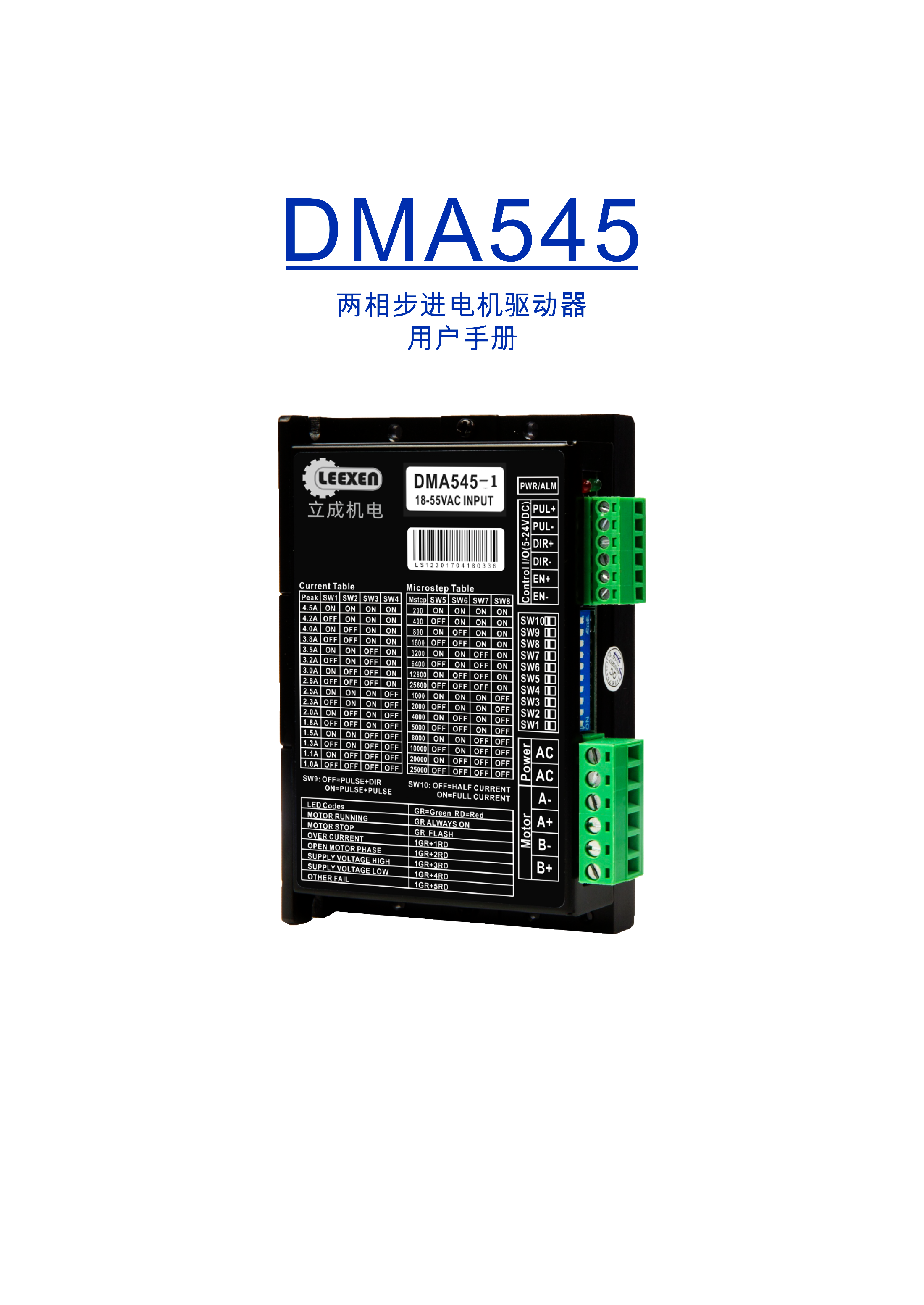 DMA545兩相步進電機驅(qū)動器是基于PI流控制算法設(shè)計的高性價比細分型驅(qū)動器,具有優(yōu)越的性能表現(xiàn),高速大力矩輸出,低噪音,低振動,低發(fā)熱,特別適合OEM客戶的大批量應(yīng)用場合。DMA545驅(qū)動器可通過撥碼開關(guān)選擇運行電流和細分,有16種細分,16種電流供選擇,具有過壓,欠壓,相電流和總電過流保護,其輸入輸出控制信號均采用光電隔離。