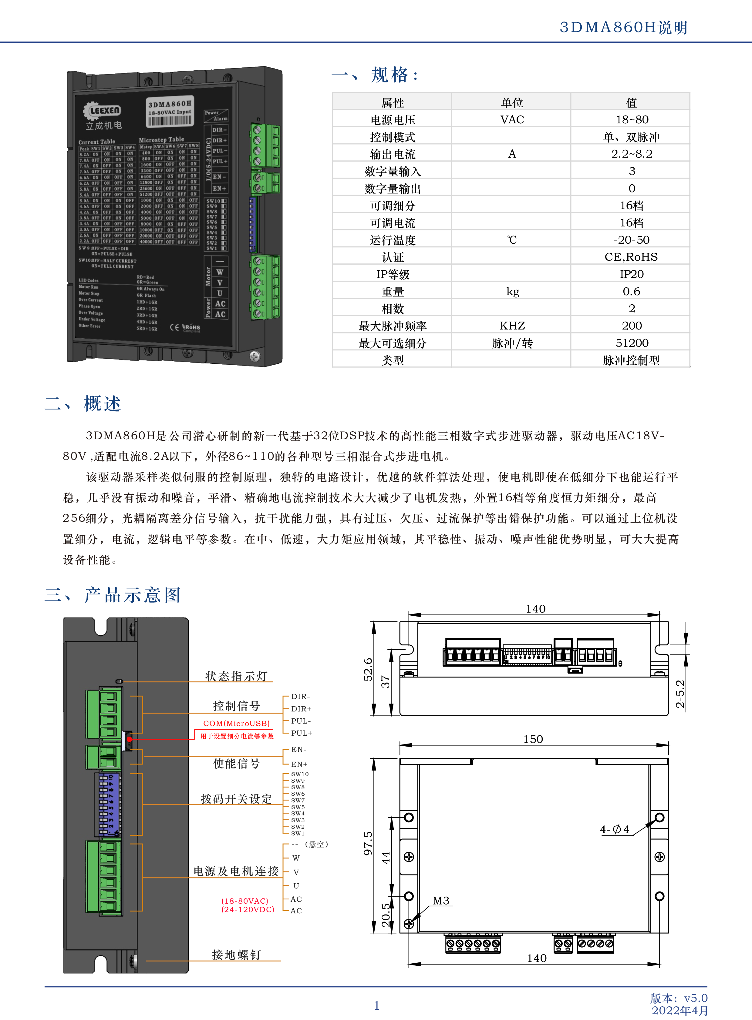 3DMA860H-1型3相開環(huán)步進(jìn)電機(jī)驅(qū)動器,是公司潛心研制的新一代基于32位DSP技術(shù)的高性能三相數(shù)字式步進(jìn)驅(qū)動器,驅(qū)動電壓AC18V80V,適配電流8.2A以下,外徑86~110的各種型號三相混合式步進(jìn)電機(jī)。