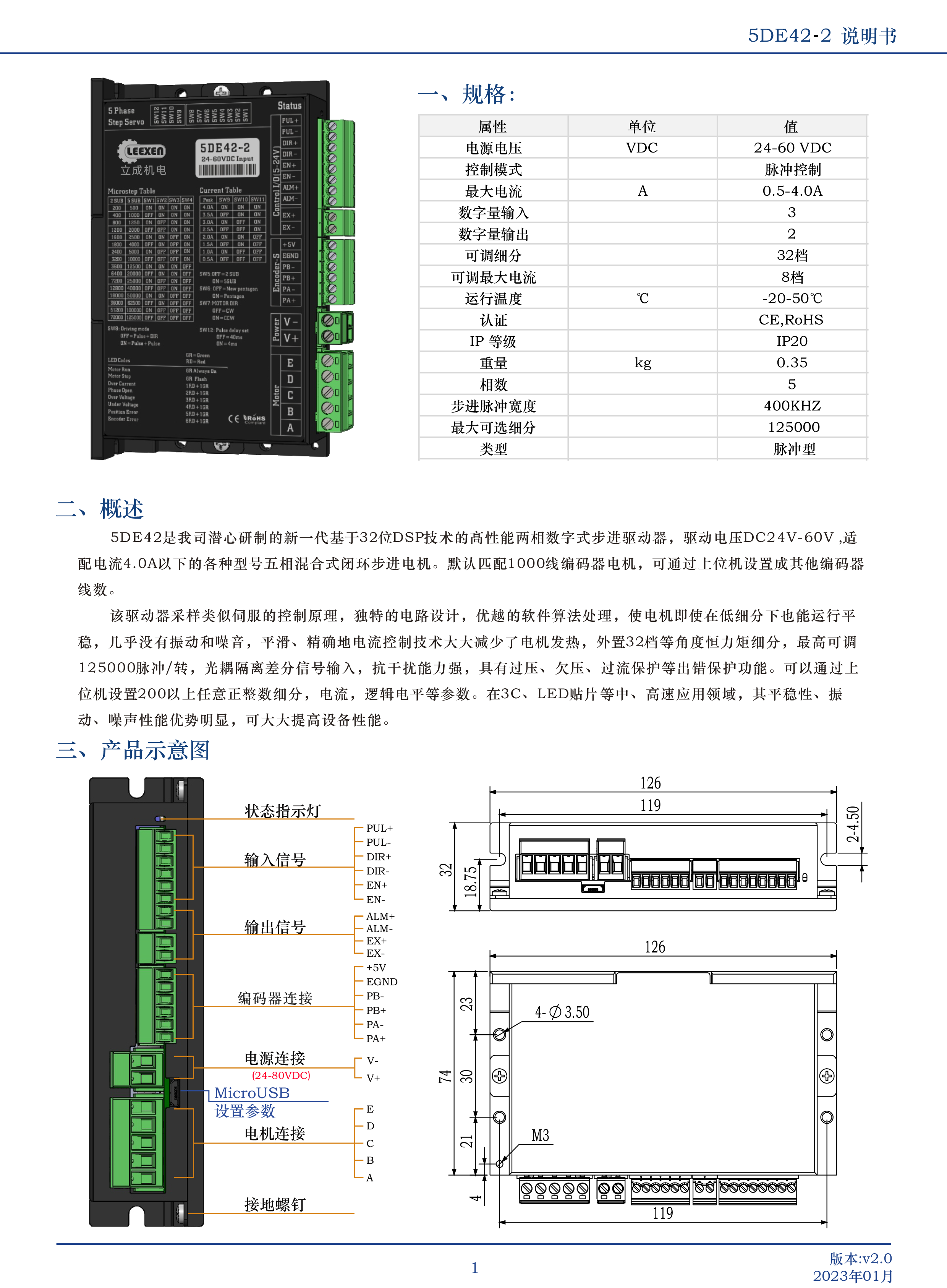 5DE42-2是我司潛心研制的新一代基于32位DSP技術(shù)的高性能兩相數(shù)字式步進(jìn)驅(qū)動(dòng)器,驅(qū)動(dòng)電壓DC24V-60V,適配電流4.0A以下的各種型號(hào)五相混合式閉環(huán)步進(jìn)電機(jī)。默認(rèn)匹配1000線編碼器電機(jī),可通過上位機(jī)設(shè)置成其他編碼器線數(shù)。該驅(qū)動(dòng)器采樣類似伺服的控制原理,獨(dú)特的電路設(shè)計(jì),優(yōu)越的軟件算法處理,使電機(jī)即使在低細(xì)分下也能運(yùn)行平穩(wěn),幾乎沒有振動(dòng)和噪音,平滑、精確地電流控制技術(shù)大大減少了電機(jī)發(fā)熱,外置32檔等角度恒力矩細(xì)分,最高可調(diào)125000脈沖/轉(zhuǎn),光耦隔離差分信號(hào)輸入,抗干擾能力強(qiáng),具有過壓、欠壓、過流保護(hù)等出錯(cuò)保護(hù)功能。可以通過上位機(jī)設(shè)置200以上任意正整數(shù)細(xì)分,電流,邏輯電平等參數(shù)。在3C、LED貼片等中、高速應(yīng)用領(lǐng)域,其平穩(wěn)性、振動(dòng)、噪聲性能優(yōu)勢(shì)明顯,可大大提高設(shè)備性能。
